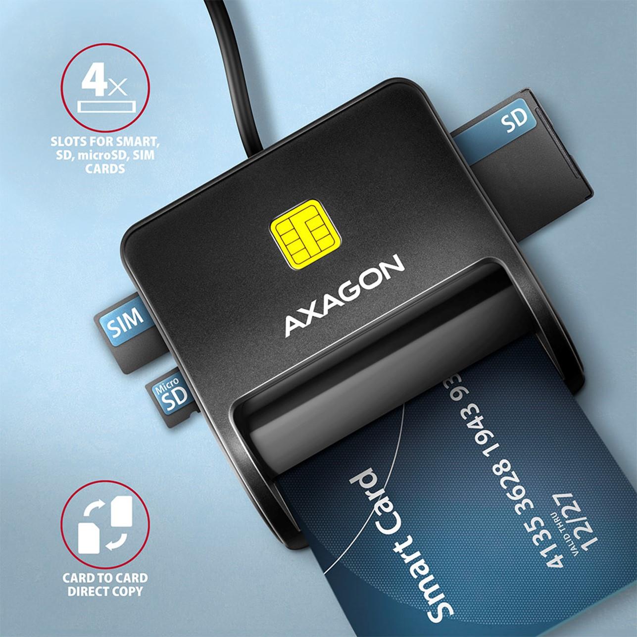 Kompaktni čitač pametnih kartica AXAGON CRE-SM3SD s USB 2.0 sučeljem. Čitač podržava sve uobičajene kontaktne formate pametnih kartica, čip kartice i druge kartice uključujući kontaktne bankovne platne karticei li kontaktne elektroničke osobne kartice. Čitač je kompatibilan s većinom nacionalnih aplikacija elektroničkih osobnih iskaznica.