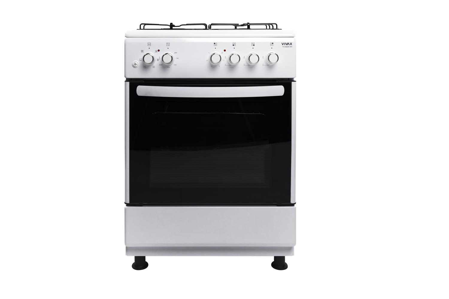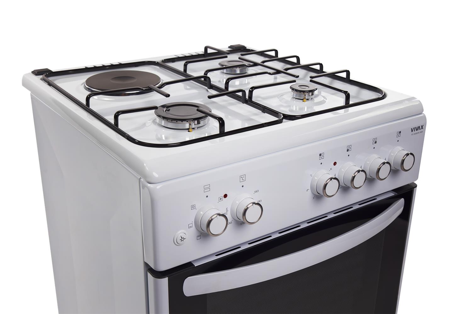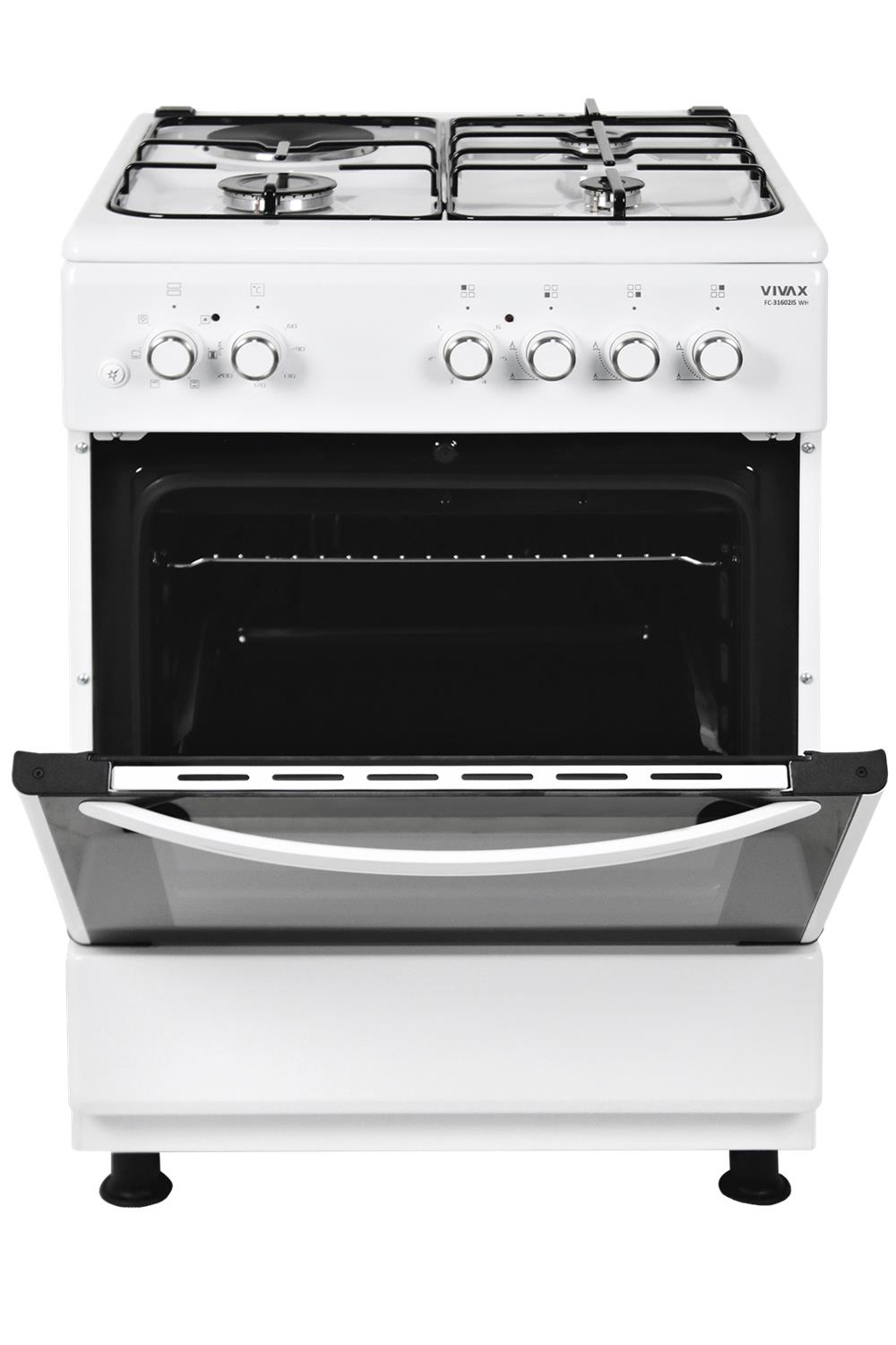 VIVAX FC-31602IFS WH: ventilatorska pećnica 64 l s grilom, energetski razred A, širina 60 cm, 3 plinska plamenika, 1 električna ploča, dvostruko staklo vrata i preklopna ladica za praktično kuhanje.