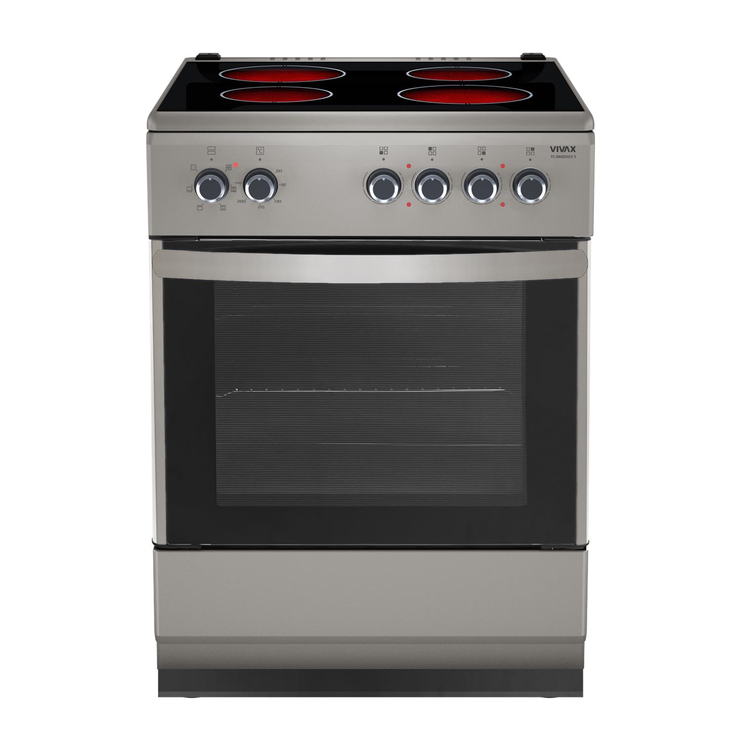 VIVAX HOME samostojeći štednjak FC-04602VCF S, 4 vitrokeramičke zone (2×1200 W, 2×1800 W), pećnica 64 L, ventilator, 250 °C, digitalni timer, energetski razred A, dimenzije 60×85×60 cm.